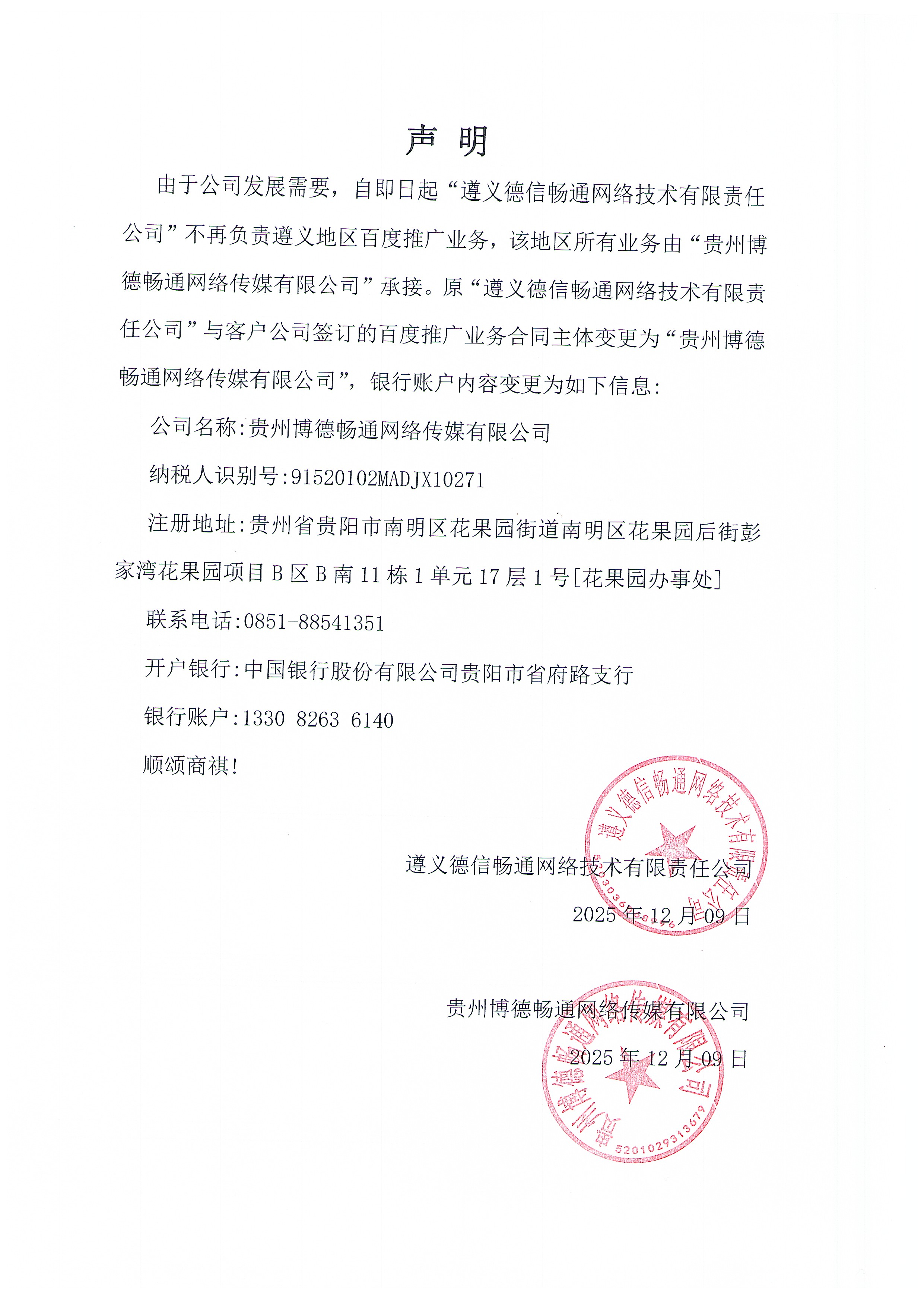 | 贵州博德畅通网络传媒有限公司承接遵义地区百度推广业务声明 |